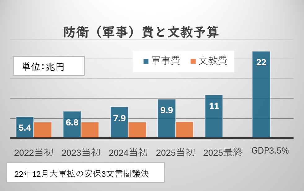 トランプ米大統領の要求は3.5%(22兆円)。これに応える増税が今後予想されます。手始めに、戦後初めての軍事増税がはじまります。異常な防衛(軍事)予算の伸び!