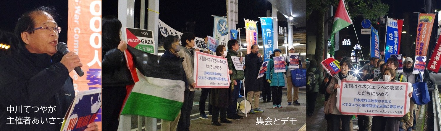 新年早々に世界を揺るがす米国のベネズエラ侵略。主権国家を攻撃し、大統領夫妻を拉致して、今後のベネズエラを運営し、石油や鉱物資源をわがものにするという。国連憲章をはじめとした国際法、米国内法も踏みにじる戦争犯罪です。ガザ虐殺に続く無法を許してはいけません。1月7日ただちに行動しました。